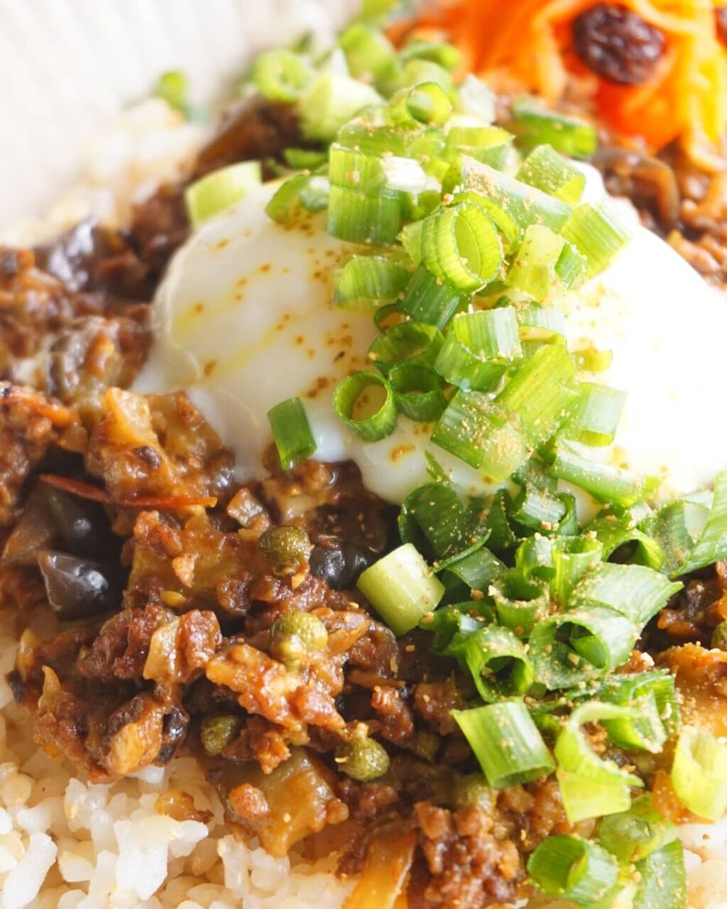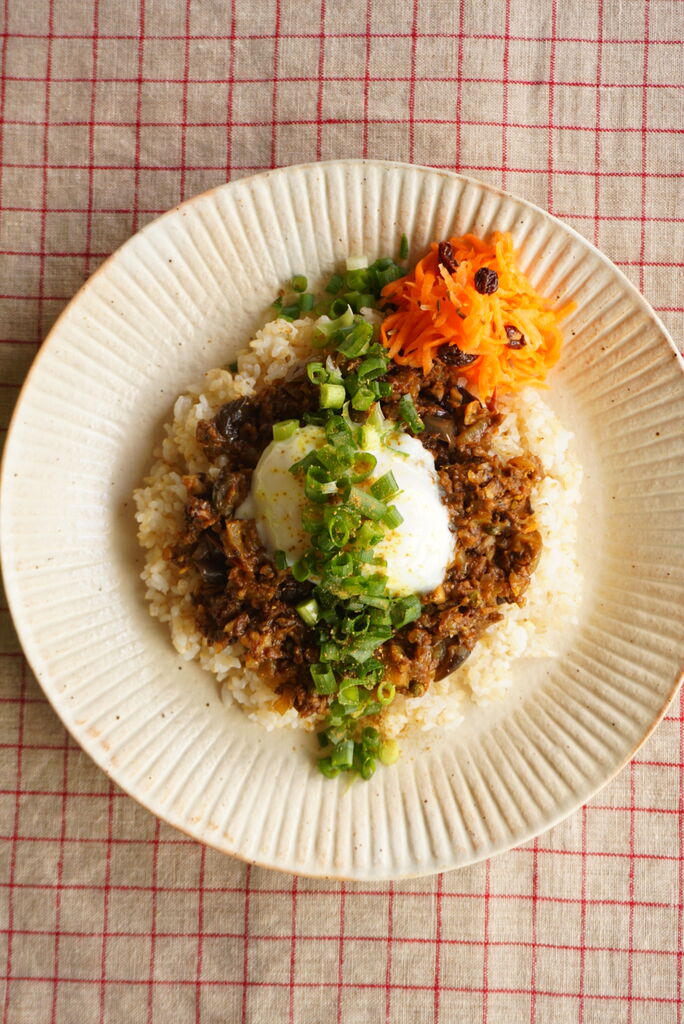 らっきょうとしめじのシンプルなカレーですが、とうもろこしご飯に焼肉を乗せて、がっつりスタミナカレーにしてみましたよ。豆ごはんなど、ご飯をアレンジしたり、トッピングでも楽しんでくださいね。